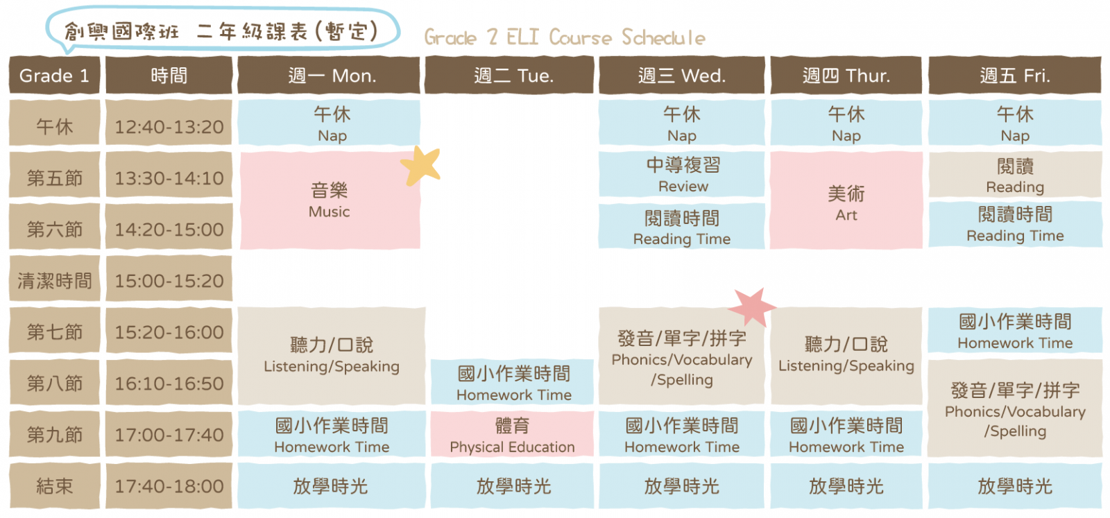 課程仿效美國國小的教學安排,涵蓋聽說讀寫及藝能科目等多元領域。孩子們將沉浸在全英語環境中,讓英語不僅是第二語言,更成為他們日常生活與學習的工具。