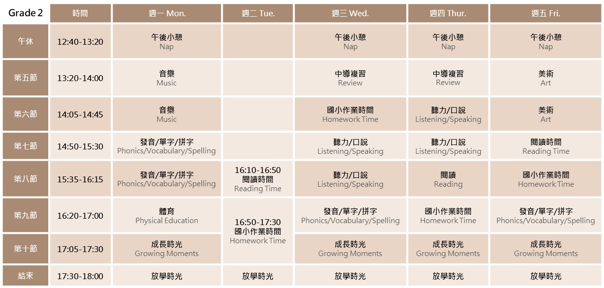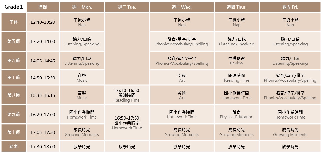 - 上課時間:每週一至週五12:40-18:00(週二16:10-18:00), 最遲請於18:00前接回。