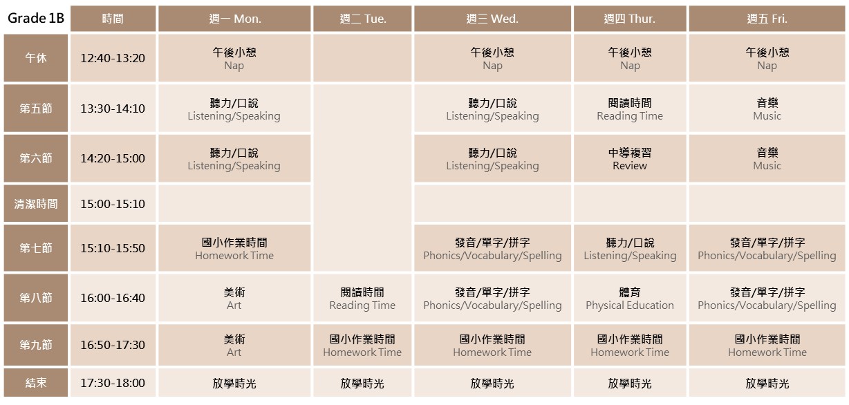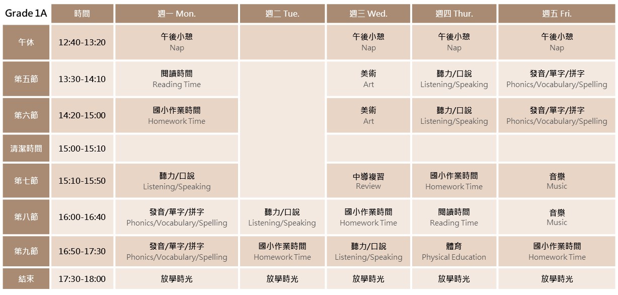 - 上課時間:每週一至週五12:40-17:30(週二16:00-17:30), 最遲請於18:00前接回。